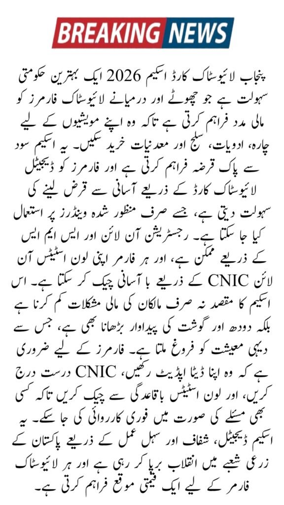 The Livestock Card Scheme Punjab registration and online loan status check system is a powerful initiative that empowers livestock farmers with interest-free credit, digital tracking, and convenient access to essential supplies. Farmers are encouraged to register early, keep their data updated, and check their loan status regularly to fully benefit from this valuable Punjab Government support program.