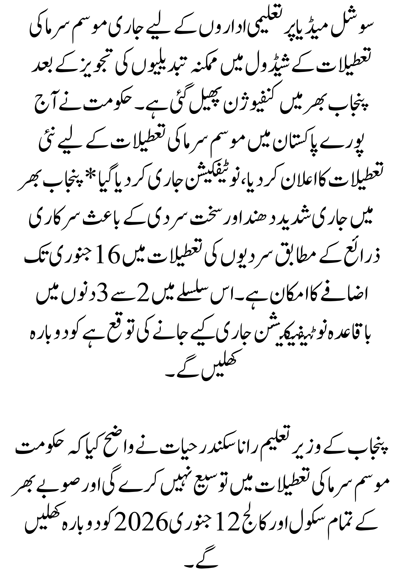 The announcement of a new holiday during winter vacation across Pakistan is a timely and thoughtful decision by the government. With schools reopening on 12 January 2026, students get additional protection from harsh weather conditions. Parents are advised to stay connected with official school notices and government updates. This move reflects a strong commitment to student welfare and public safety.