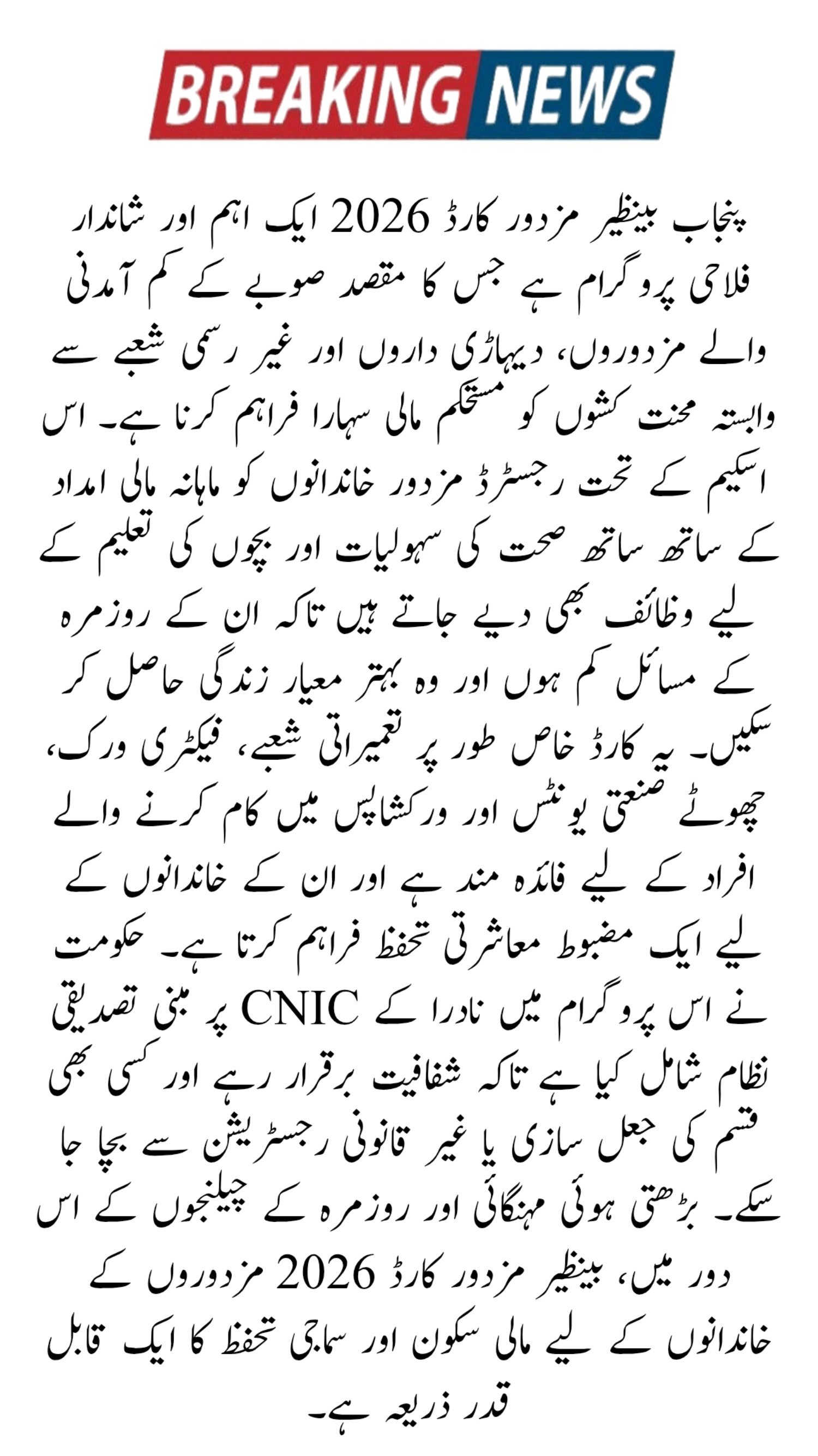 The Benazir Mazdoor Card 2026 is designed to strengthen social protection for workers by providing monthly cash support and essential services. Eligible workers are advised to complete their registration as early as possible to avoid missing out on benefits.