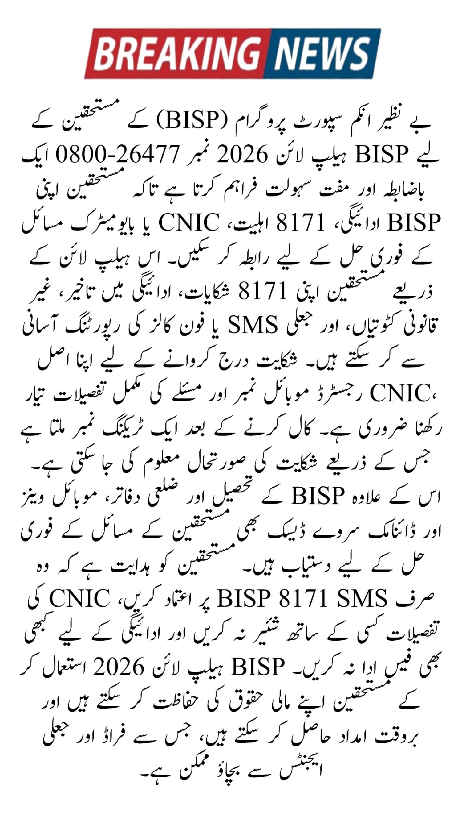 The official BISP helpline number is 0800-26477.