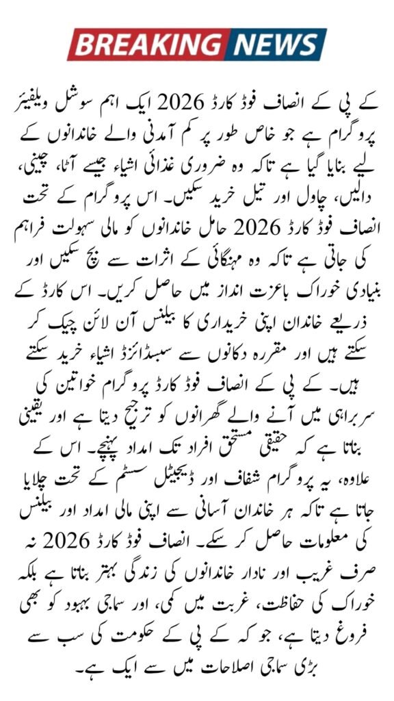 The KPK Insaf Food Card 2026 is a government initiative aimed at improving food security for low-income families in Khyber Pakhtunkhwa. Under this Insaf Food Card program, eligible families receive a digital or physical card to purchase essential groceries at subsidized rates. This program 2026 ensures transparency and targets the most deserving households for financial relief.