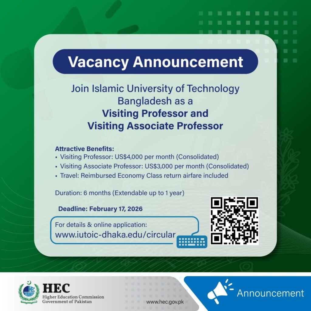 The Islamic University of Technology visiting faculty vacancies 2026 are announced for several departments. Both Visiting Professor jobs 2026 and Visiting Associate Professor jobs 2026 are available, offering flexible academic opportunities.