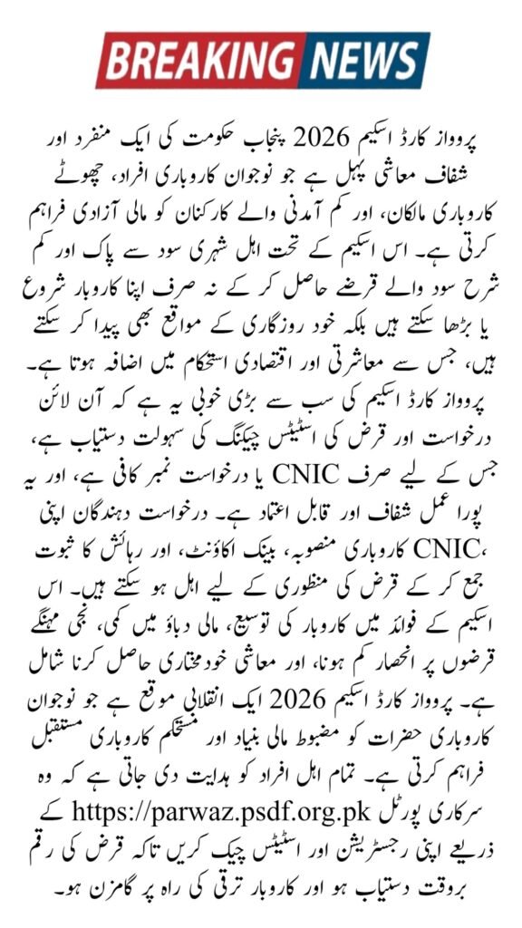 The Parwaz Card Scheme 2026 is a flagship Punjab Government program designed to support small business owners, entrepreneurs, and low-income workers by providing interest-free and subsidized loans. Through this initiative, eligible citizens can apply online and later check their loan application status easily using the official Parwaz PSDF portal. This guide explains the registration process, eligibility criteria, benefits, required documents, and how to check your loan status online in simple and clear English for Google Discover readers.