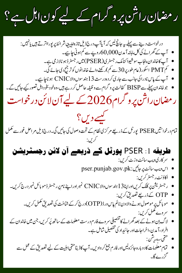 Great news for deserving families! The Punjab government has launched the Ramzan Rashan Program 2026 to provide direct financial and food support. This year, eligible households can receive Rs. 10,000 cash assistance along with a free ration bag delivered to their home. To ensure you benefit, you must complete your application through the official Punjab Socio-Economic Registry (PSER) before the deadline.