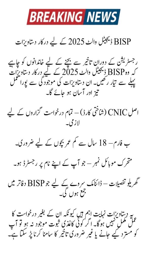 To avoid delays during registration, families must prepare some required documents for BISP Digital Wallet 2025. Keeping these documents ready will make the process quick and easy.